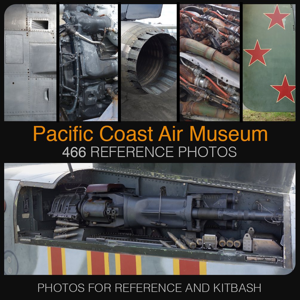Hey there! I've collected 466 photos from my trip to the Pacific Coast Air Museum. I was happy that it was an overcast day so these photos are great for photo-bashing as they generally have soft shadows. This pack includes weapons, aircraft details, decals, sensors, jet shapes, cockpit, rusted tech components, and clean tech components. All the photos are 5472 x 3648 and of good quality. If you purchase this you are free to use the images royalty free for your art, however you are not authorized to reproduce, sell, or give away the set; each purchase is a single user license only.